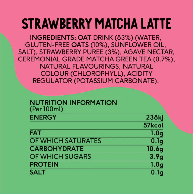 Gluten-Free Oat Drink (10% Gluten-Free Oats, Sunflower Oil, Salt), Strawberry Puree Not From Concentrate, Agave Nectar, Natural Flavourings, Ceremonial Grade Matcha From Japan, Chlorophyll, Acidity Regulator (Potassium Carbonate