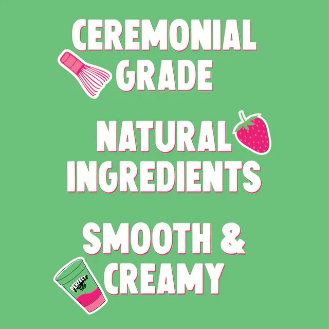 Meet your go-to strawberry matcha latte, perfectly chilled and ready to fuel your day. Made with ceremonial-grade matcha, and velvety gluten-free oat milk, this balanced blend delivers a natural, smooth boost (contains 60mg caffeine—equivalent to 1 shot of espresso).