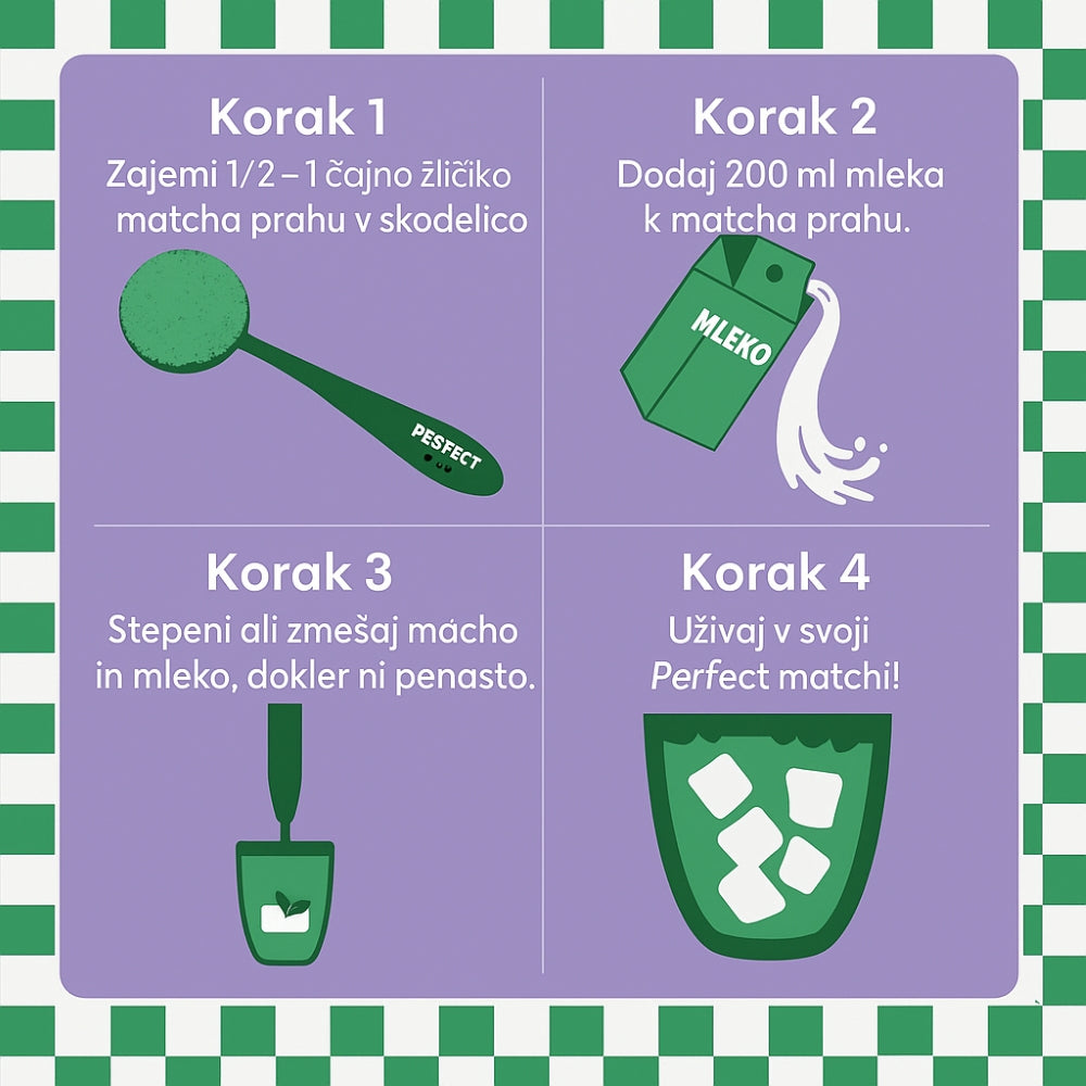 Matcha je fino mlet zeleni čajni prašek, cenjen zaradi svoje živo zelene barve, gladkega okusa in močnih zdravstvenih koristi. Matcha zagotavlja koncentriran odmerek antioksidantov in hranil, hkrati pa daje mirno in dolgotrajno energijo, zahvaljujoč edinstveni kombinaciji kofeina in L-teanina.