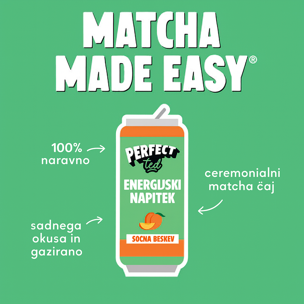 Lahko gazirana energijska pijača z okusom breskve in ceremonialnim matcha čajem iz Japonske.