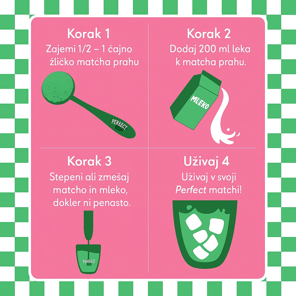 Matcha je fino mlet zeleni čajni prašek, cenjen zaradi svoje živo zelene barve, gladkega okusa in močnih zdravstvenih koristi. Matcha zagotavlja koncentriran odmerek antioksidantov in hranil, hkrati pa daje mirno in dolgotrajno energijo, zahvaljujoč edinstveni kombinaciji kofeina in L-teanina.