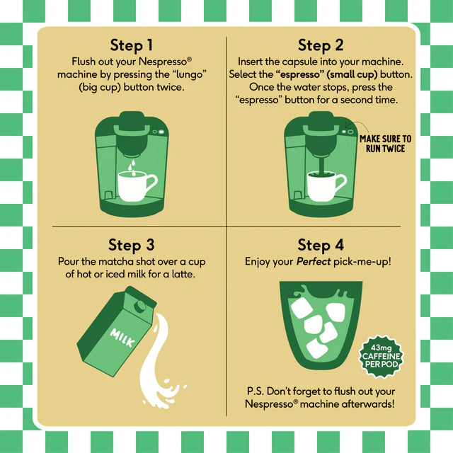 Prelijte matcha shot čez skodelico vročega ali hladnega mleka in si pripravite matcha latte.